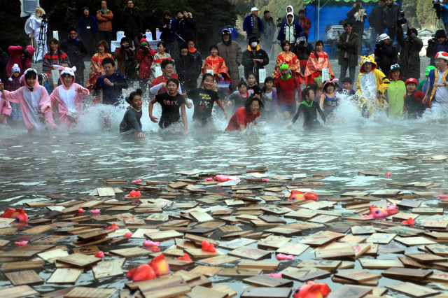 - 在仙人浴池還會舉行歌牌大會,由四人一組進行團體競賽。歌牌以杉木製成,即使弄濕也能安心使用。當主持人朗讀描述熊野魅力的短句時,參賽者便會同時濺起水花全力搶牌,就連觀眾也能樂在其中。這項深受縣內外旅客喜愛的活動於每年1月舉辦。