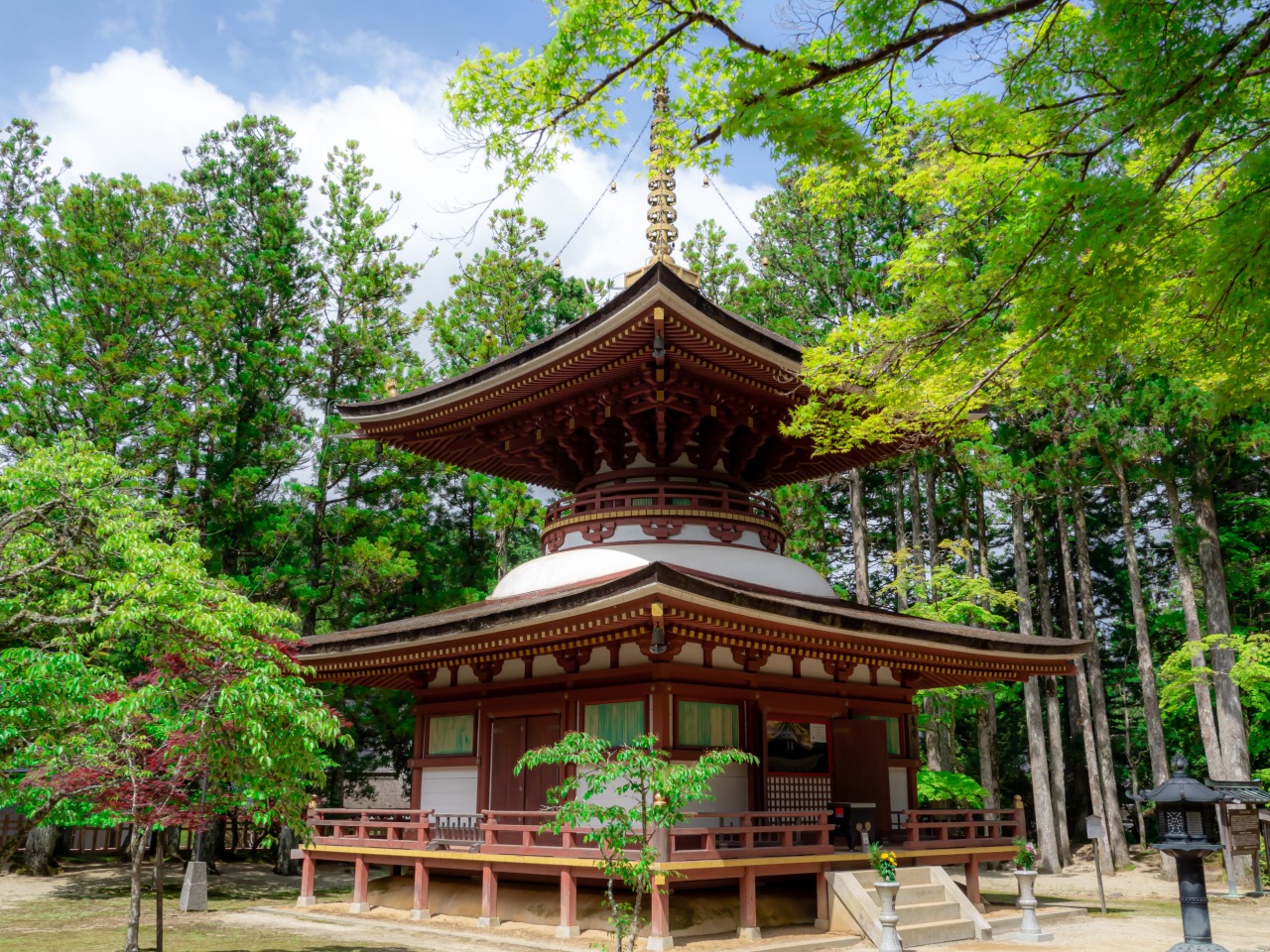 The Danjo Garan Sacred Temple Complex can be described as the center of Koyasan, which was opened by Kukai (aka Kobo Daishi) as a place for secret training in Shingon esoteric Buddhism. Several temples are located inside the Danjo Garan, and the 49-meter tall Great Stupa is of an especially splendid and impressive scale.