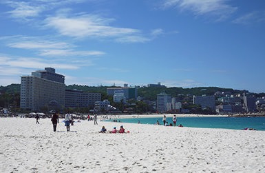Shirarahama is a beach in Shirahama Town with a climate that is comparatively warm for Honshu. The swimming season here, is pronounced open on May 3, and the beach is famous for having the earliest-starting swimming season in Honshu. Shirarahama Beach is the “sister beach” of Waikiki Beach, and the beautiful contrast between its powdery white sand and marine blue ocean is sure to leave an impression. In Summer the beach is lined with sun umbrellas made of palm leaves, creating a tropical mood.