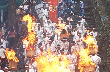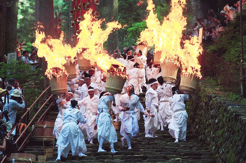 Nachi-no-Ogi Matsuri is a festival held at Kumano Nachi Taisha Grand Shrine annually on July 14th. It is a Shinto ritual in which participants carry large flaming torches down the path from the shrine to a sacred waterfall. The path is used to lead the shrine's 12 deities down to the waterfall, and the ritual is carried out to purify the route.