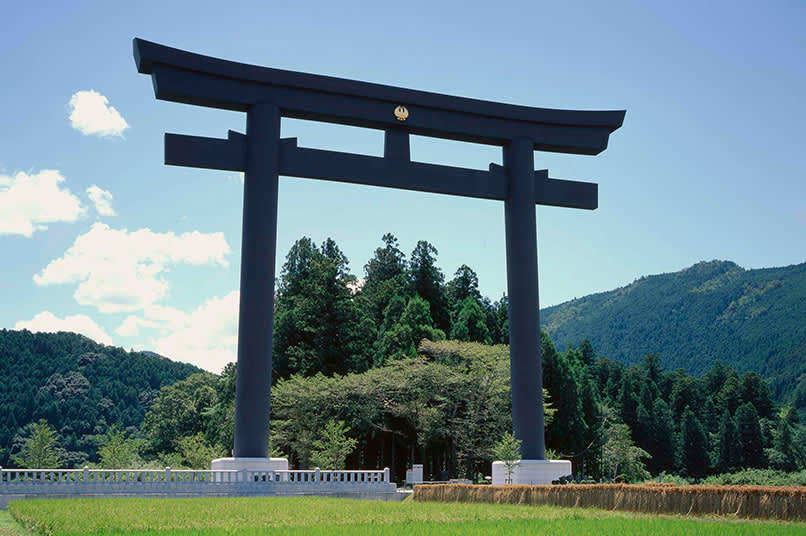 Located on a delta between mountain ranges is Oyunohara. All of the Kumano Kodo pilgrimage routes lead to this sandbank, where the Kumano Hongu Taisha Grand Shrine once stood. Here stands the world’s largest Torii shrine gate, measuring 33.9 meters tall and 42 meters wide. This monolithic structure symbolizes the division between the secular and spiritual worlds; it is the entrance to a sacred area.